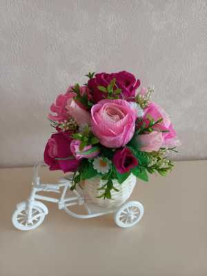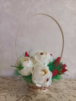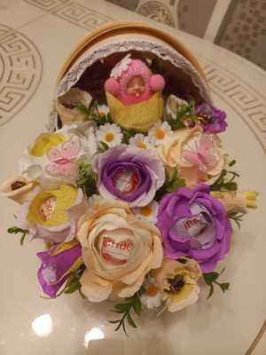 Корзина с цветами и конфетами, хороший подарок к любому празднику . В корзине 17 конфет.