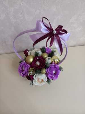 Композиция выполнена из декоративной хвои, нов.шаров и роз сделанных из гофророванной бумаги. Внутри розочек конфеты.
