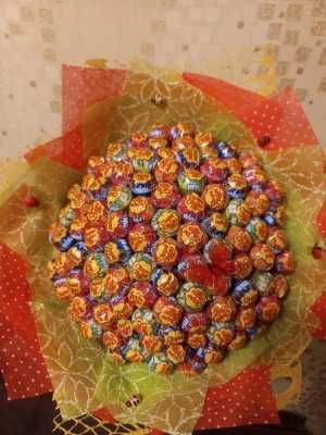 Красивый и вкусный букет из конфет Chupa Chups со вкусами лайма, лимона и арбуза; киви, клубники и апельсина; манго, киви...