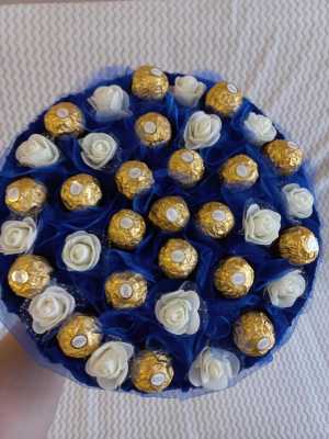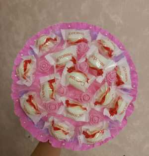 В букете 21 конфета Ферерро Роше! Так же в букете использованы розочки, шелковые ленты и органза.