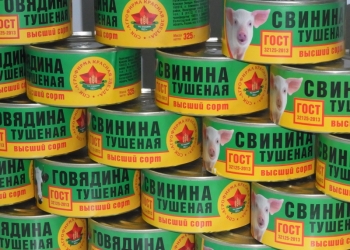 Свинина тушеная, высший сорт, 325 гр., вложение в коробку 36 шт. Сертификат качества "Настоящий вологодский продукт".